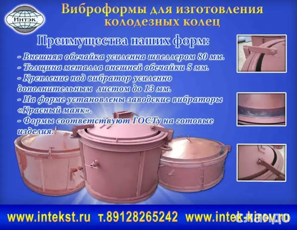 Группа предприятий ООО «Интэк» производит и реализует металлические формы для производства колодезных колец КС-7.9; КС-10.9; КС-15.9; КС-20.9, а так же формы для крышек и днищ колодцев (ПП-10; 1ПП-15; 1ПП-20). По желанию заказчика наш завод может изготовить формы под любой другой размер. При покупке металлической формы, технология производства колодезных колец предоставляется бесплатно.Качество, гарантия, низкие цены, сервис-все это сочетается в одном слове-«Интэк» У наших сотрудников вы можете получить исчерпывающие ответы на все ваши вопросы. 8-912-700-67-31