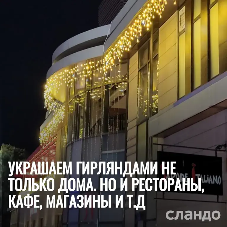 Сделайте ваш фасад ярким и привлекательным вместе с нами. Мы украшаем гирляндами не только дома, создавая в них уютную и праздничную атмосферу. Но и рестораны, кафе, магазины, а также различные общественные места, чтобы привлечь внимание посетителей и подарить им хорошее настроение.