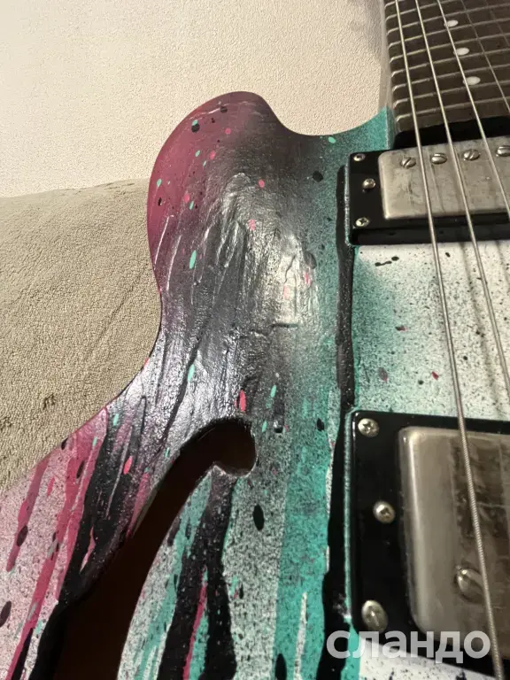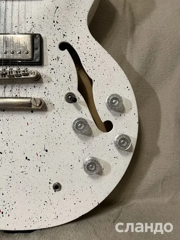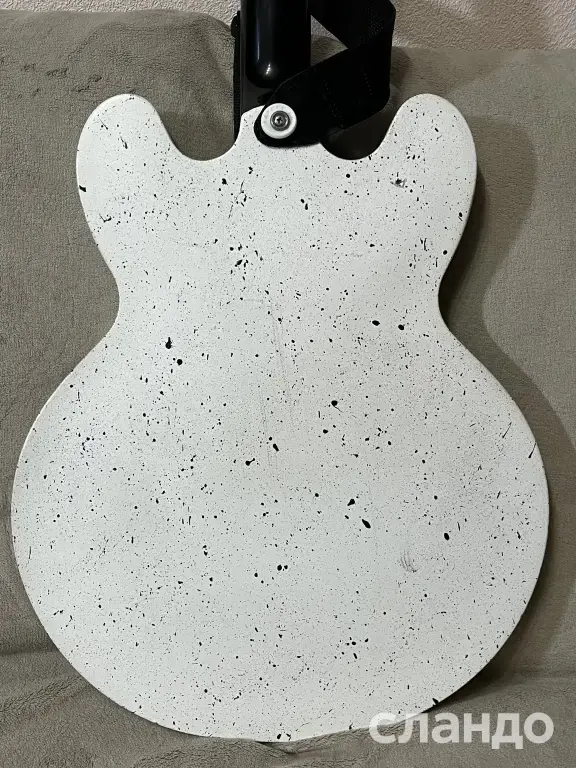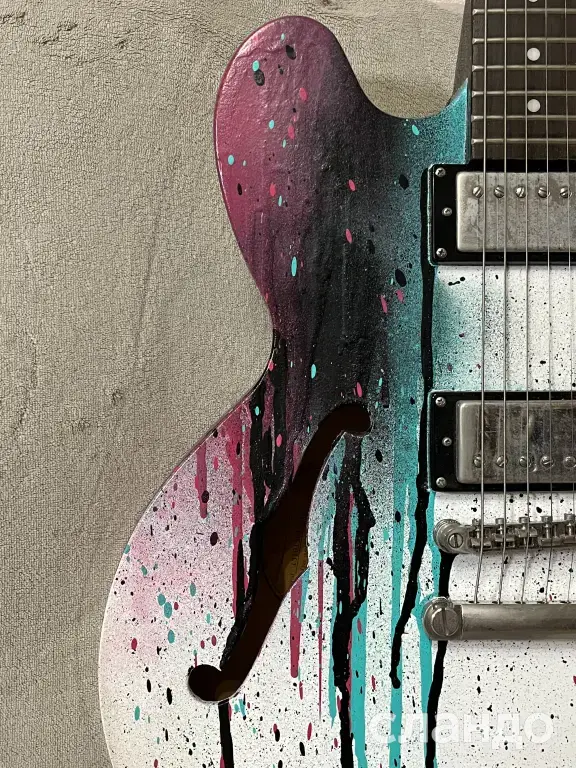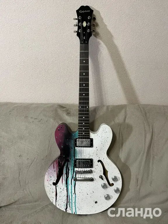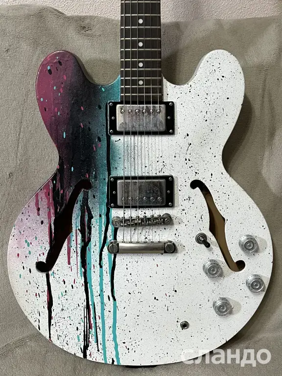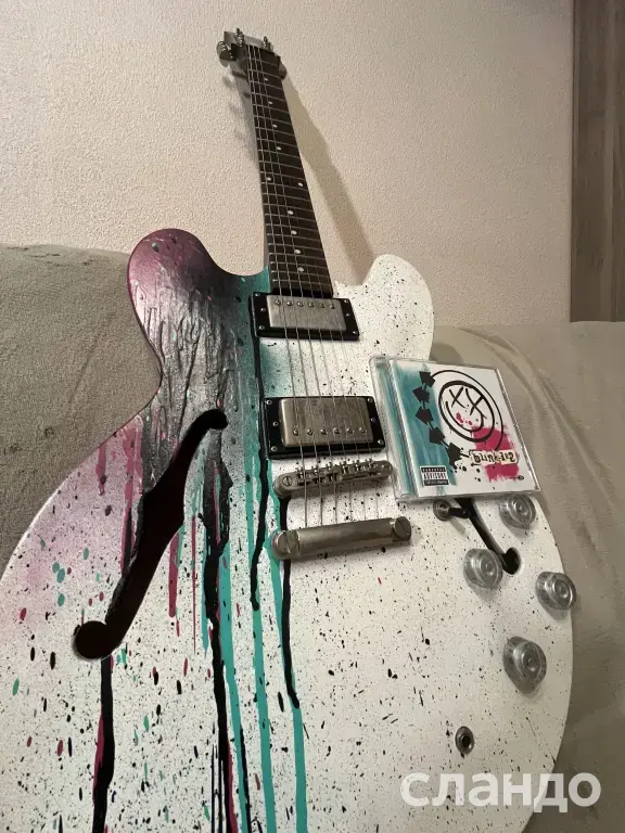 Перекрашен в стиле гитар Gibson ES-333 Тома Делонга времен 2012-2013 годов. Этот Эпифон не повторяет конкретную раскраску одной из гитар Тома, я хотел сделать что-то свое, но в манере фронтмена Angels & Airwaves. Цвета выбраны в стиле безымянного альбома blink-182 2003 года.